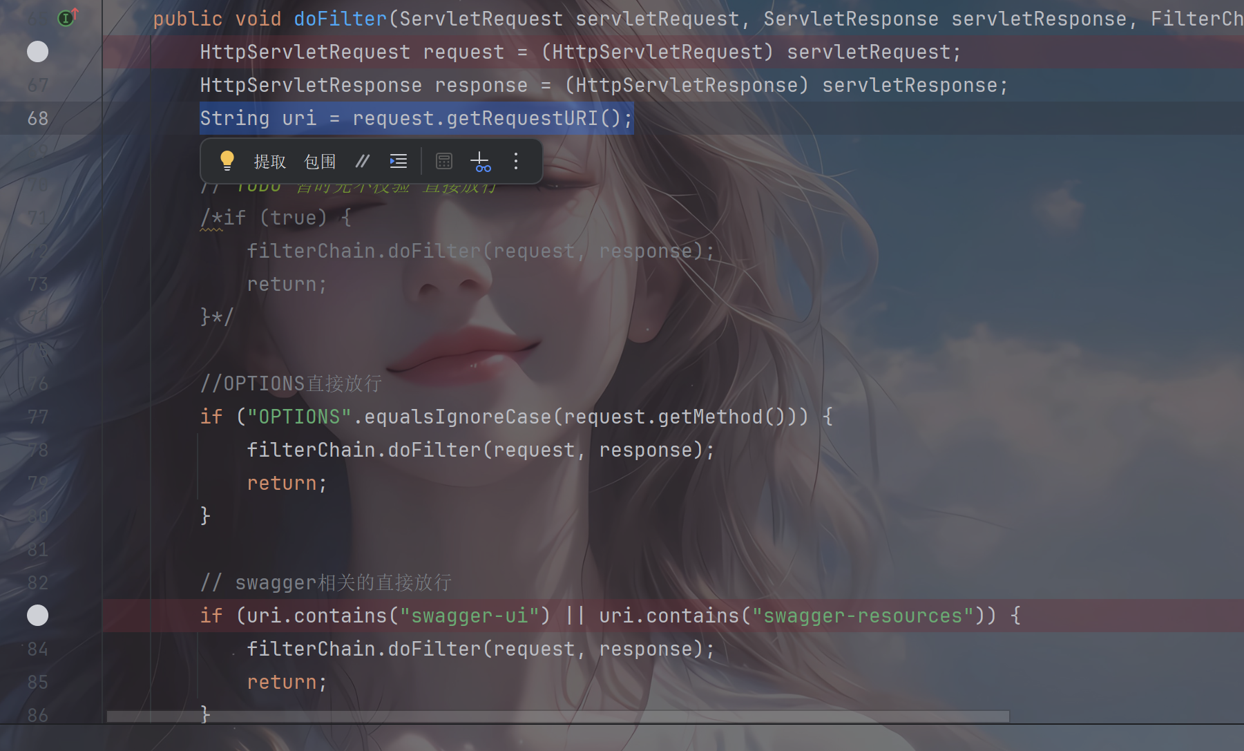 | if (uri.contains("swagger-ui") || uri.contains("swagger-resources")) { filterChain.doFilter(request, response); return; }