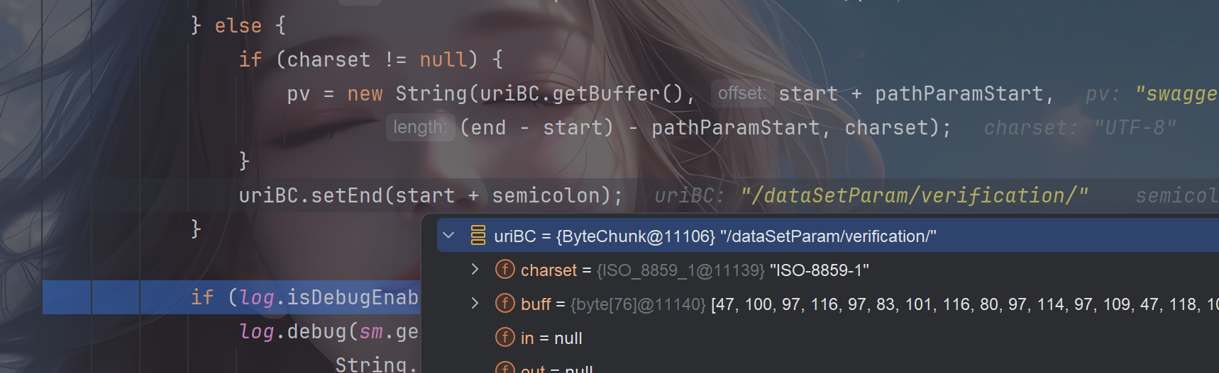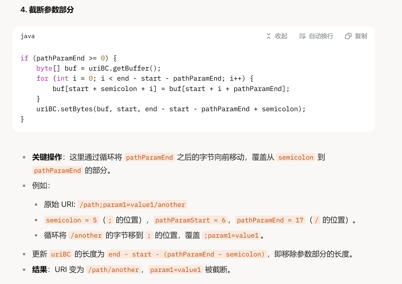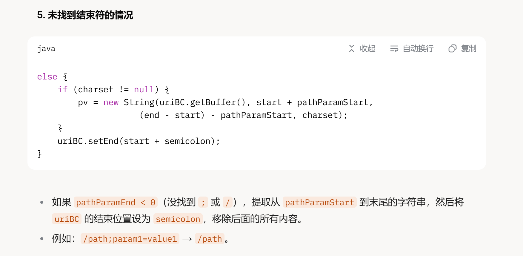 | if (pathParamEnd >= 0) { if (charset != null) { pv = new String(uriBC.getBuffer(), start + pathParamStart, pathParamEnd - pathParamStart, charset); } byte[] buf = uriBC.getBuffer(); for (int i = 0; i < end - start - pathParamEnd; i++) { buf[start + semicolon + i] = buf[start + i + pathParamEnd]; } uriBC.setBytes(buf, start, end - start - pathParamEnd + semicolon); } else { if (charset != null) { pv = new String(uriBC.getBuffer(), start + pathParamStart, (end - start) - pathParamStart, charset); } uriBC.setEnd(start + semicolon); }