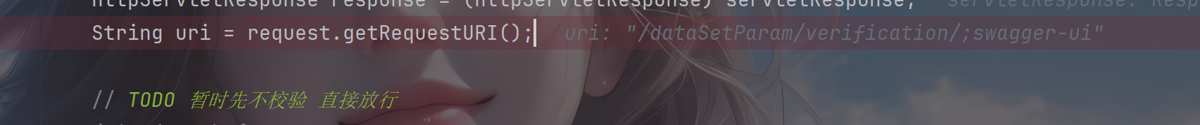可以看到这里直接用了getRequestURI 获取的接口,这个东西之前就爆出来有解析差异导致的权限绕过,下面刚刚好有个url包含swagger-ui 就直接放行,那么利用; 就可以直接绕过权限校验