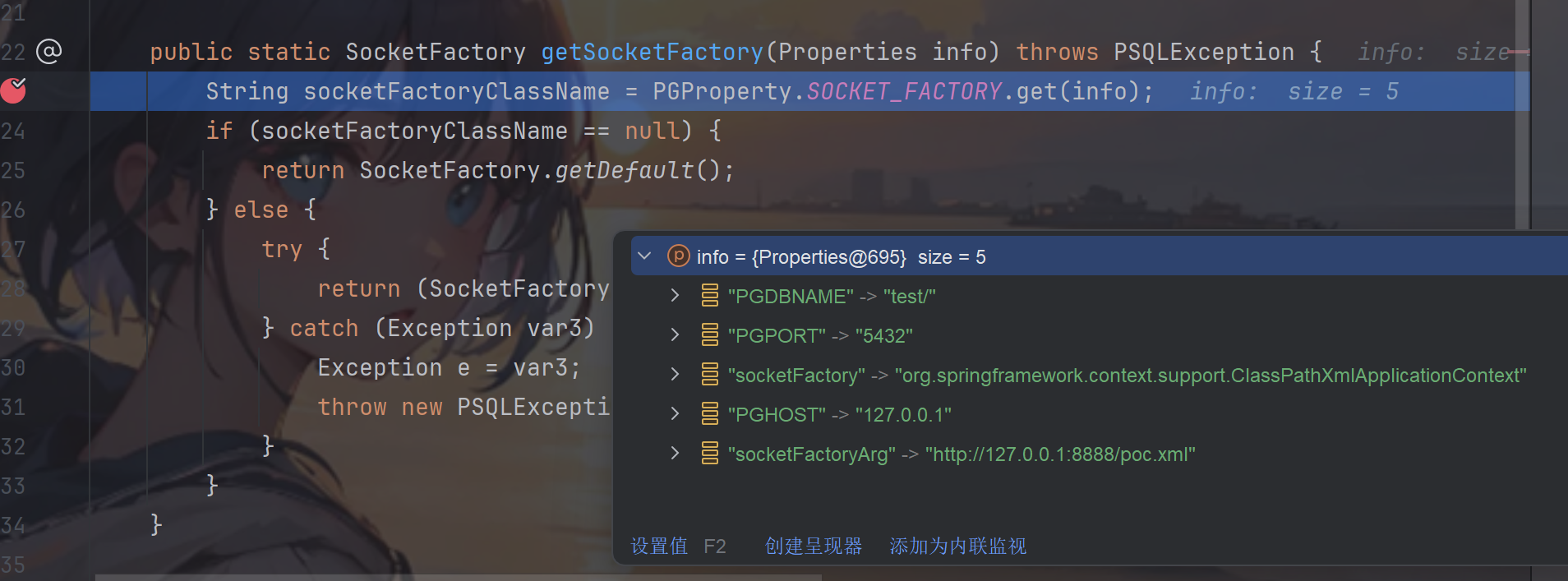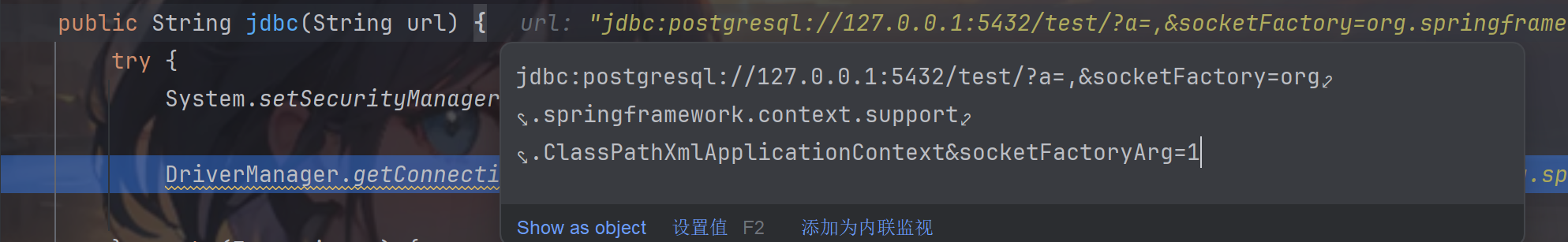 而在springboot的controller中获取到的url为jdbc:postgresql://127.0.0.1:5432/test/?a=,&socketFactory=org.springframework.context.support.ClassPathXmlApplicationContext%26socketFactoryArg=1