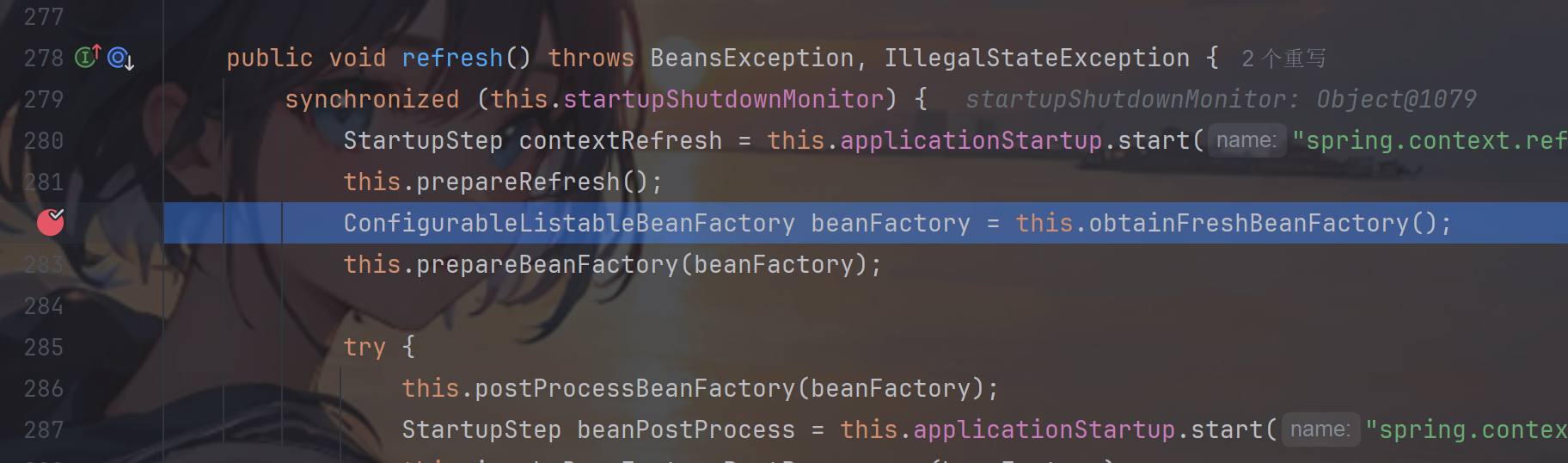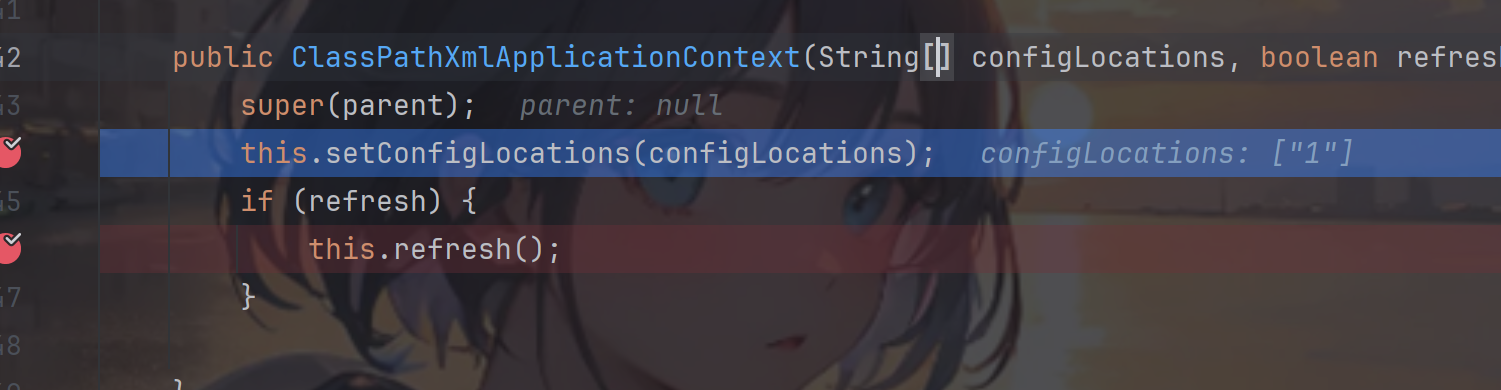 这里对configLocations 进行赋值,即xml的远程url地址,然后调用到refresh() 方法,跟进看看