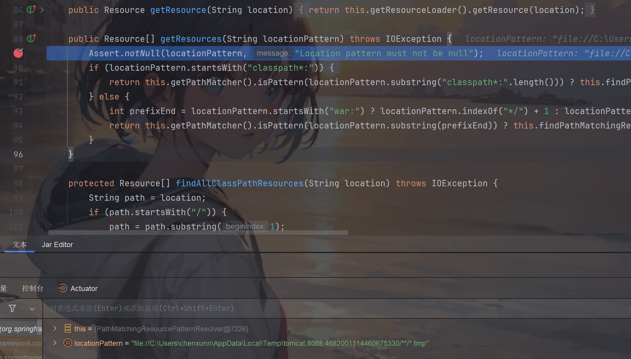 即org.springframework.core.io.support.PathMatchingResourcePatternResolver#getResources 调用栈如下(只贴了从ClassPathXmlApplicationContext 开始的)